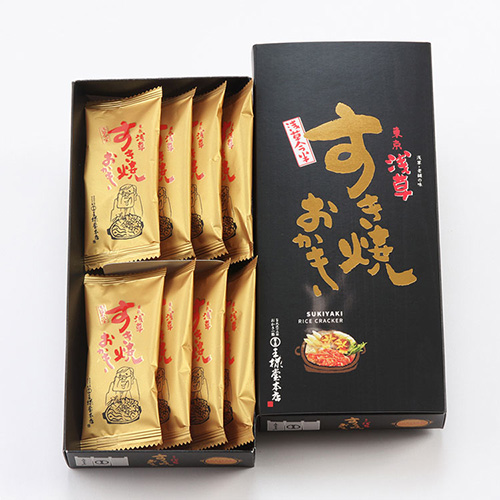 「王様堂本店」と「浅草今半」のコラボレーションにより生まれた、新しい浅草名物。国産もち米100%の主原料に、浅草今半の牛肉そぼろ煮を醤油たれの中に細かく刻んで混ぜ込み、伝統のすき焼の味を再現しました。