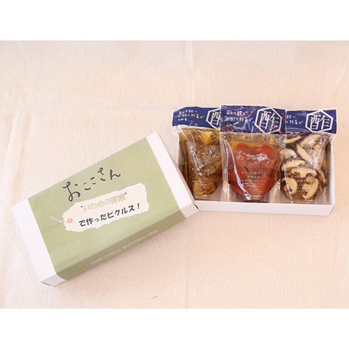 おここさん いわきの野菜で作ったピクルスはいわき市産のとまと、しいたけ、なめこをしょうゆ・だしを加えたお酢調味液に漬け、野菜を調味液の旨味が感じられる和風ピクルスです。
