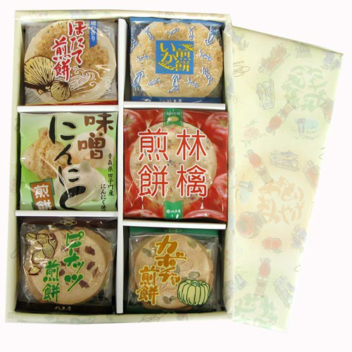人気商品の創作せんべい、いか、ほたて、味噌にんにく、林檎、クッキータイプのピーナッツ、カボチャせんべいの6種類を、箱に詰合わせました。贈り物におすすめです。