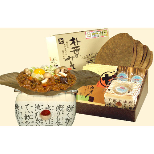 内容量:野菜入り味噌150g×3パック、卓上コンロ、火皿、コンロ台、金網、全形朴葉6枚、固形燃料6個