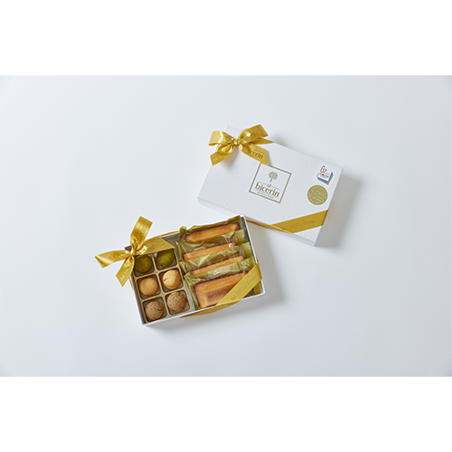 内容量:Bicerinフィナンシェ【G7HIROSHIMA瀬戸田レモン】×4個,バーチ・ディ・ダーマ(プレーン×2個,伊勢神宮神宮司庁御用達芳翠園抹茶×2個,エスプレッソ×2個)