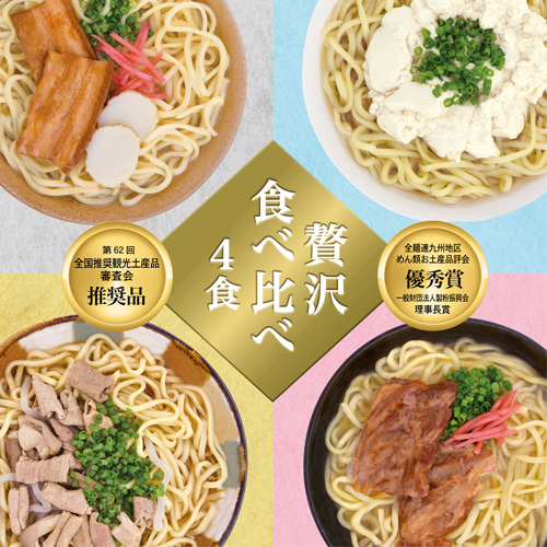 1箱で4つの味が楽しめる沖縄そばの食べ比べセットです。三枚肉、ソーキ肉同様人気のゆし豆腐、中味を具材にしました。スープは豚骨味と鰹味の2種類。塩麴で発酵させた島唐辛子を米酢で抽出した辛味調味料付き。